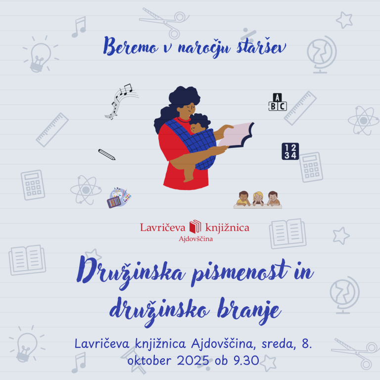 Začenjamo z novo sezono srečanj Beremo v naročju staršev. Na prvem srečanju se bomo posvetili pomenu bralne pismenosti in kako otroka vzgojimo v bralno pismenega odraslega. Poudarili bomo pomen skupnega