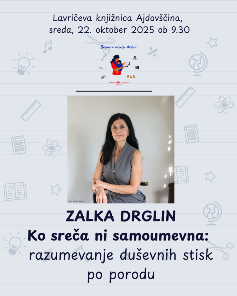 Na tretjem srečanju krožka Beremo v naročju staršev bomo gostili doktorico ženskih študij in feministične teorije, Zalko Drglin, ki se posveča kulturi rojevanja in obporodnim duševnim stiskam žensk. Materinstva ne