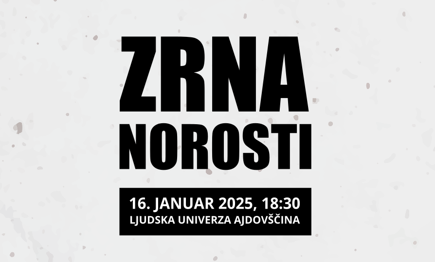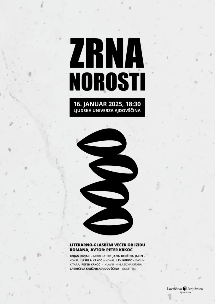 V petek, 16. 1. 2026, ob 18.30, vas vabimo v dvorano Ljudske univerze Ajdovščina na glasbeno-literarni večer ob izidu knjige Zrna norosti Petra Krkoča.