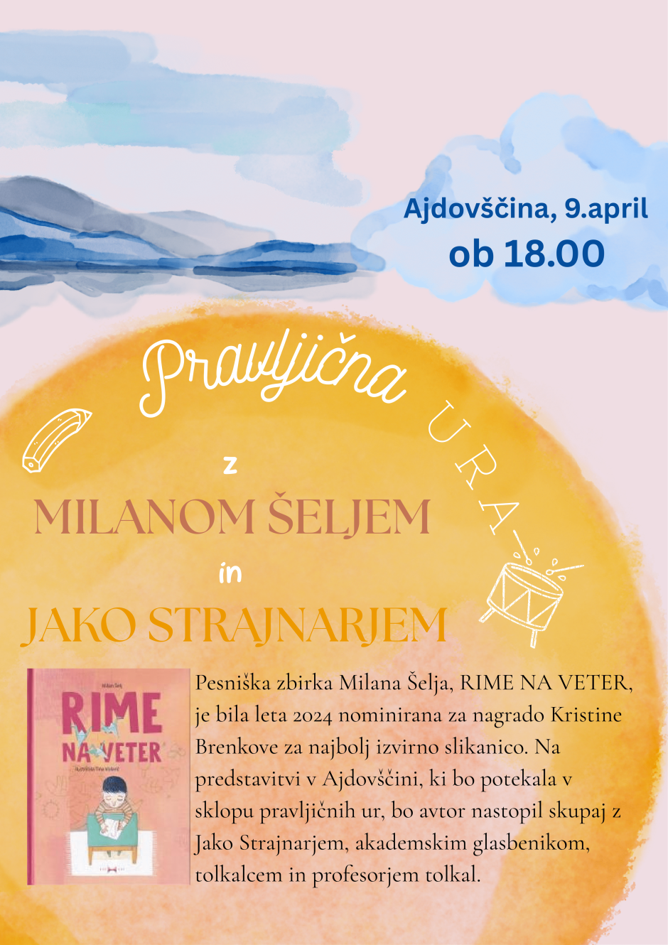 Drugo uro pravljic v mesecu aprilu bomo posvetili pesmim Milana Šelja, ki so namenjene tako bralcem začetnikom kot nekoliko starejšim šolarjem. Polne so čutnih vtisov, ki otroke spodbujajo k opazovanju narave: od drobne kapljice med praprotjo do veličastne mavrice na nebu.
