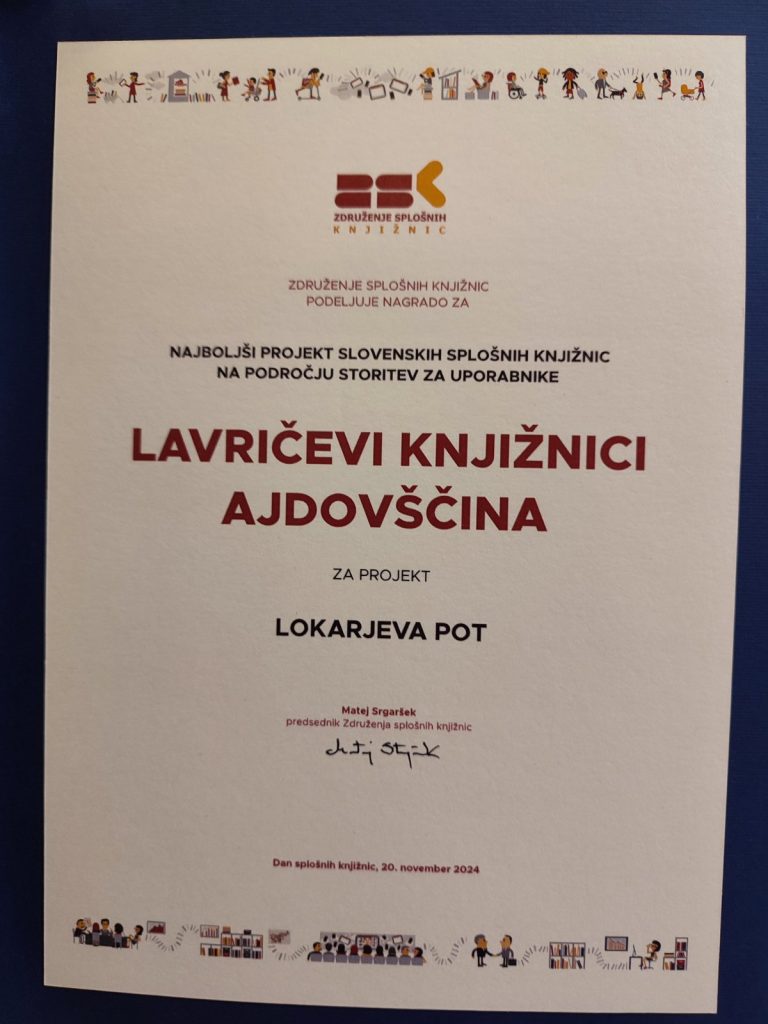 Na osrednji slovesnosti, ki jo je ob Dnevu splošnih knjižnic, 20. novembru, v Celju pripravilo Združenje splošnih knjižnic Slovenije (ZSK), je Lavričeva knjižnica Ajdovščina prejela nagrado za najboljši projekt s področja storitev za uporabnike. Prestižno stanovsko nagrado je knjižnica prejela za ureditev Lokarjeve pohodne poti, ki je del Slovenske pisateljske poti.